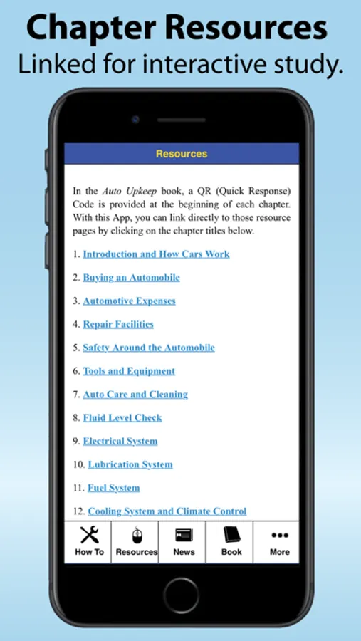 RESOURCES. Provides links to additional online resources that correlate to the chapters within the Auto Upkeep textbook.