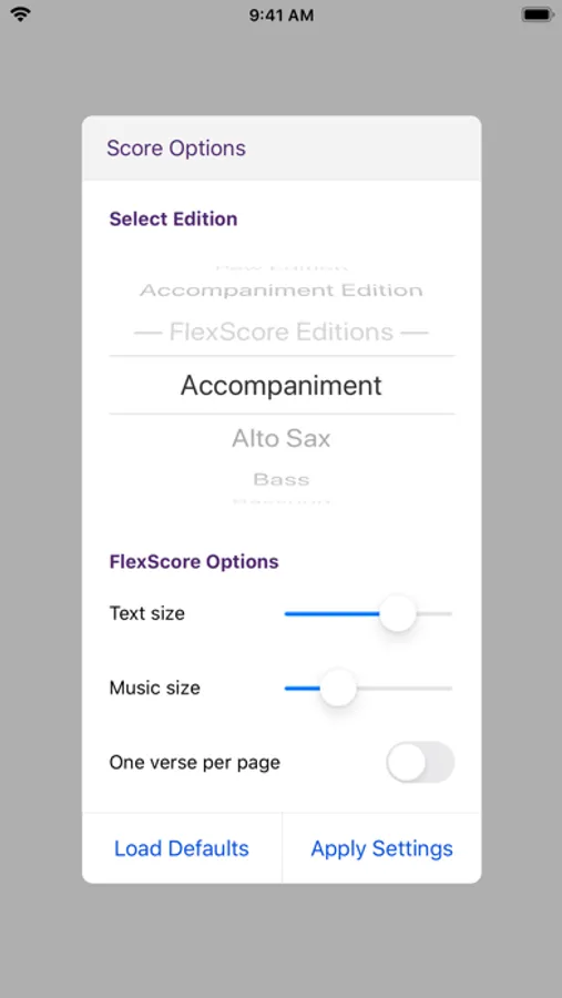 The versions offered for FlexScores include accompaniment, pew, lead sheet, projection, violin, viola, cello, bass, flute, clarinet, oboe, bassoon, alto saxophone, soprano or tenor saxophone, horn, trumpet, trombone, and tuba. For the instrumental versions, the music is transposed into an appropriate range and displayed in an appropriate clef for the instrument. The projection version enables you to connect the iPad to a projector and project hymns onto a screen.