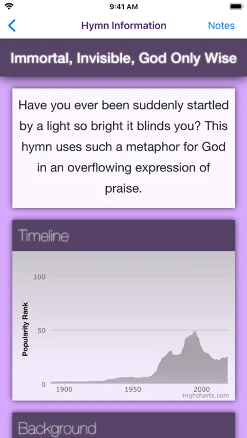 For each hymn there is a page of information that may include a description of the hymn, a brief biography of the author or composer, and information for worship leaders such as performance suggestions and available arrangements. A brief audio clip is also available.