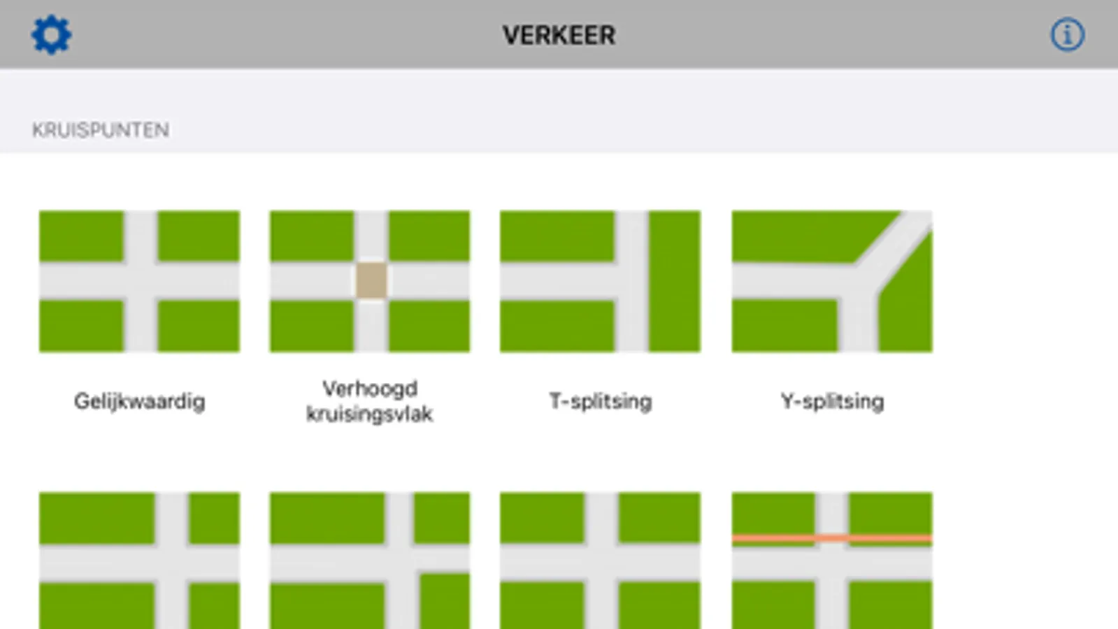 • In het hoofdscherm kan een type situatie, zoals een kruispunt, rotonde, enz gekozen worden. Ook kan er voor een interactieve kaart gekozen worden.