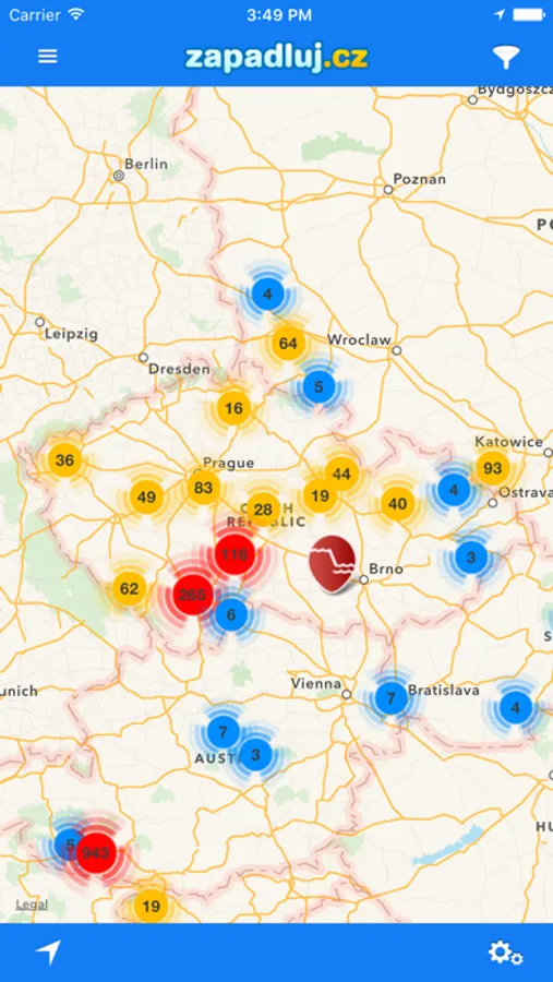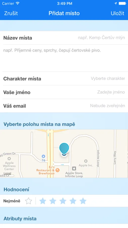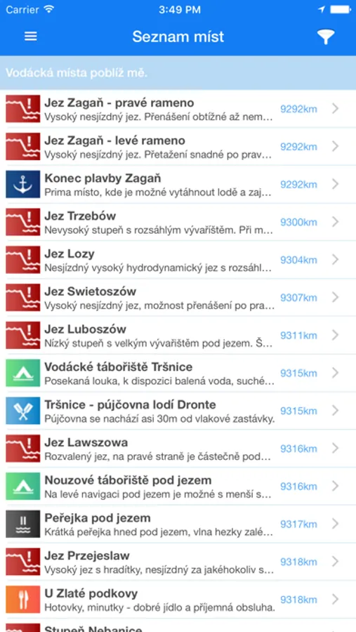 - filtrování míst podle typu (kempy, jezy, atd.)