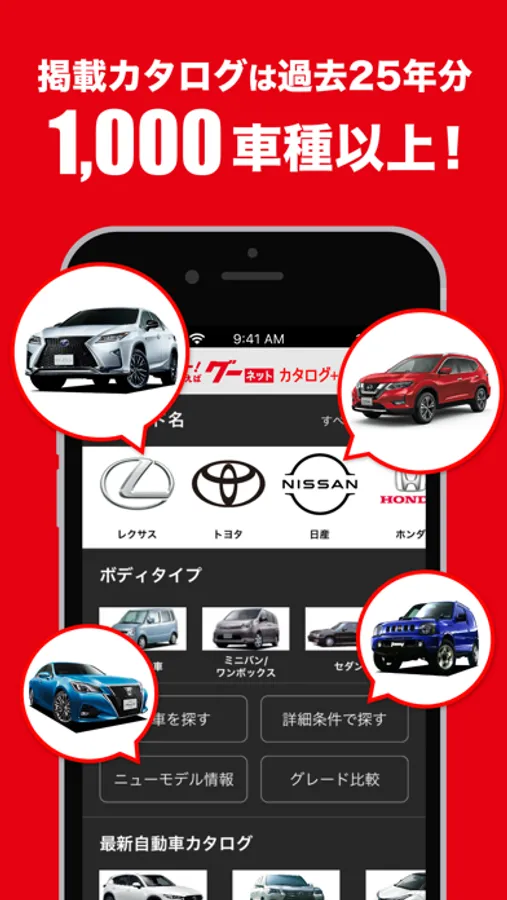 1000車種以上の国産車及び輸入車のカタログ情報データベースをいつでもどこでも調べられる、グーネットカタログ+!クルマ大図鑑があなたのポケットに!