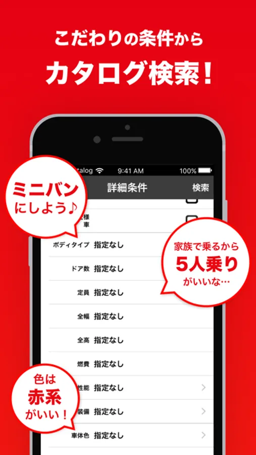 気になる燃費、燃費が12km以上のミニバンという条件でも検索出来ます。またクルマのサイズも気になるところ。狭い道路もへっちゃらの小さいクルマや、運転しやすい回転半径の小さいクルマ、チャイルドシートロック機能付きのクルマなどのこだわり条件でも検索出来ます。