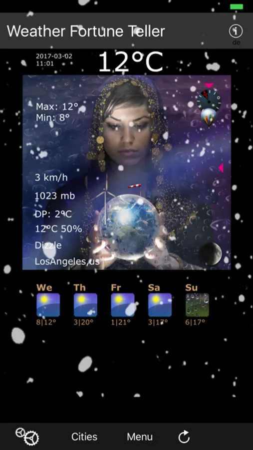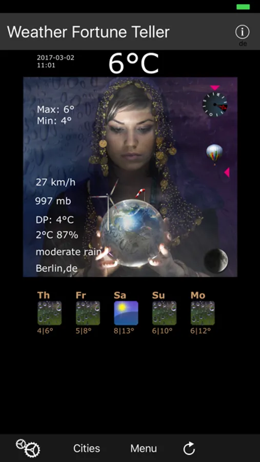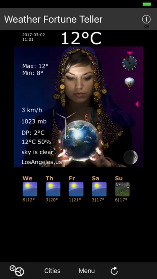 This fortune teller tells you ahead of the weather. Big Temperature display, windchill temperature, humidity, wind speed, wind direction, barometer, moonphases and more values can hardly be desired. With this weather fortune teller you can have fun with the weather. A 4-days weather forecast and more is built-in.