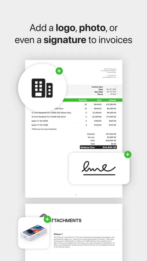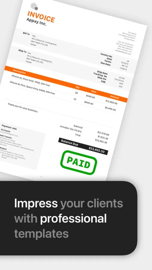 * Create invoices and estimates with only several taps from lots of elegant templates, like using a rapid generator;