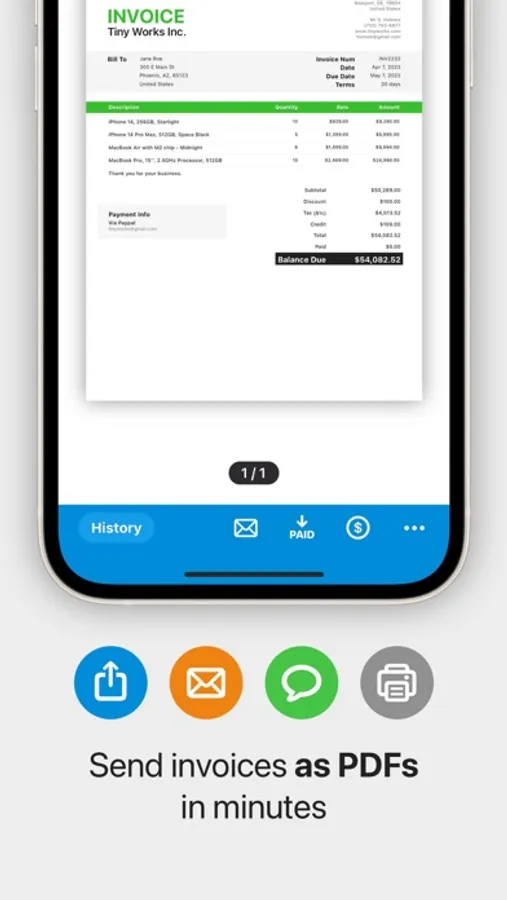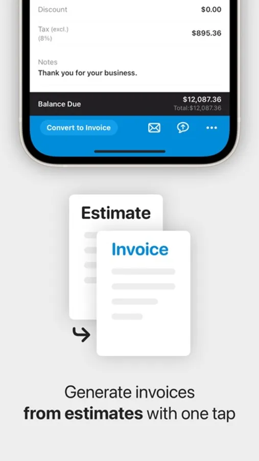 * Share invoices and estimates with your friends and customers by all means, like picture, pdf, email, iMessage, etc.