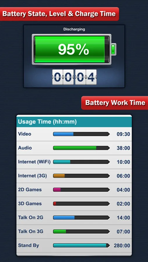 • Battery work time usage activity (video, audio, Wi-Fi and 3G internet, talk time, 2D and 3D games, stand by)
