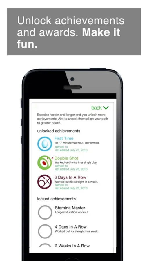 This app takes this research-proven workout and guides you through the process. Further, it tracks your results, and makes it fun by allowing you to unlock rewards as you continue working out.