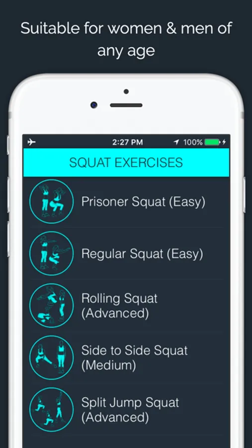 The 30 Day Squat Challenge is a simple 30 day exercise plan, where you do a set number of squat exercises each day with rest days thrown in. The workout increases intensity slowly and day 30 will test anyone. In total the app has 6 workouts with 13 squat exercise variations. The workouts and exercises are suitable for both men and women of any age and fitness levels.