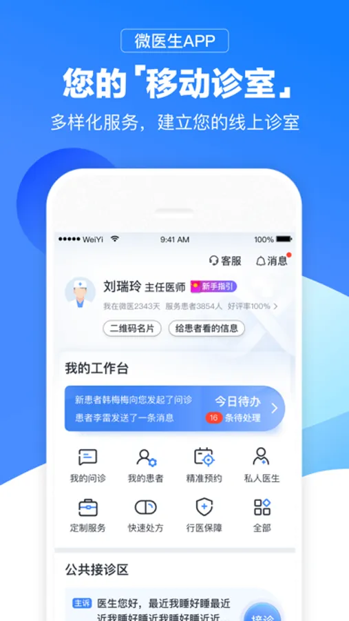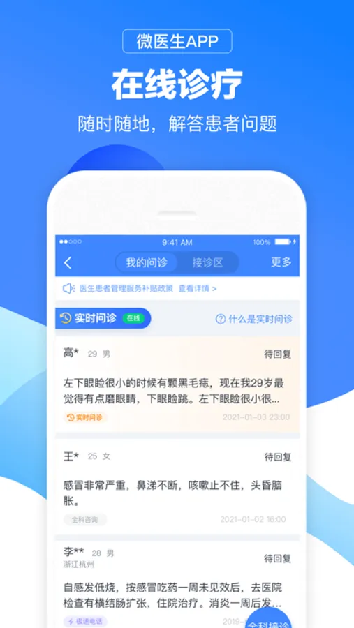 微医生(MICRO DOCTOR)是医生的“移动诊室”,医生可以为患者提供在线问诊、患者管理,管理随访跟踪患者病情;医生可以向同行发起会诊转诊,进行同事交流;