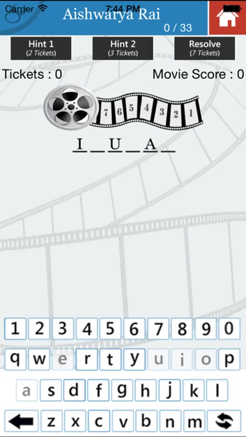 Movie name will be displayed as fill the blanks, with vowels displayed. Choose the correct alpha-numeric letters to guess the correct movie name.