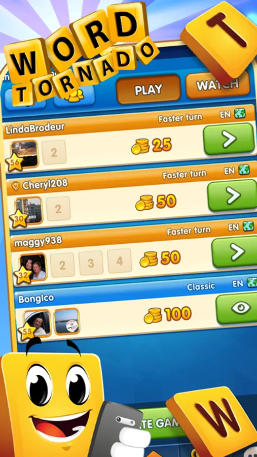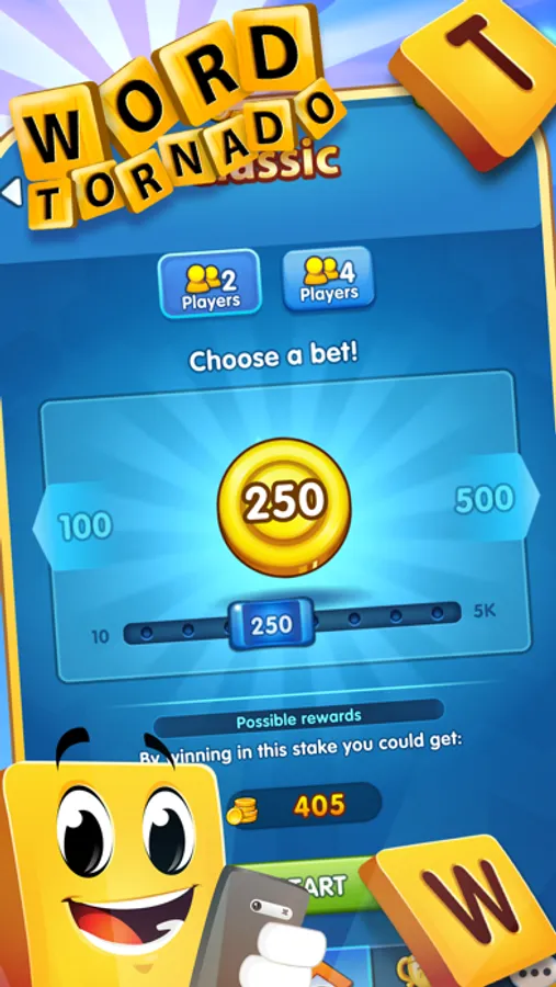 You can choose which Coin stake to play with. The higher the bet, the higher the reward, if you win of course. Play smart and you'll be the winner! Don't forget, we offer free Coins every few hours in WordTornado, so don't forget to claim them! More Coins means more free word games.