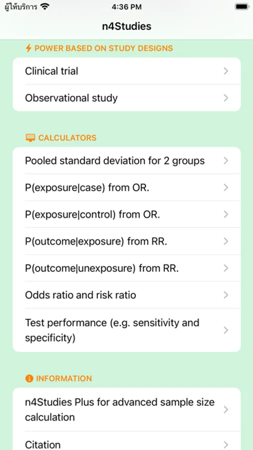 n4Studies makes it easy to calculate the sample size and the power of a study. It comes with ABSOLUTELY NO WARRANTY. However, It can help to learn and find the ways to calculate the sample size and power of the study in minutes.