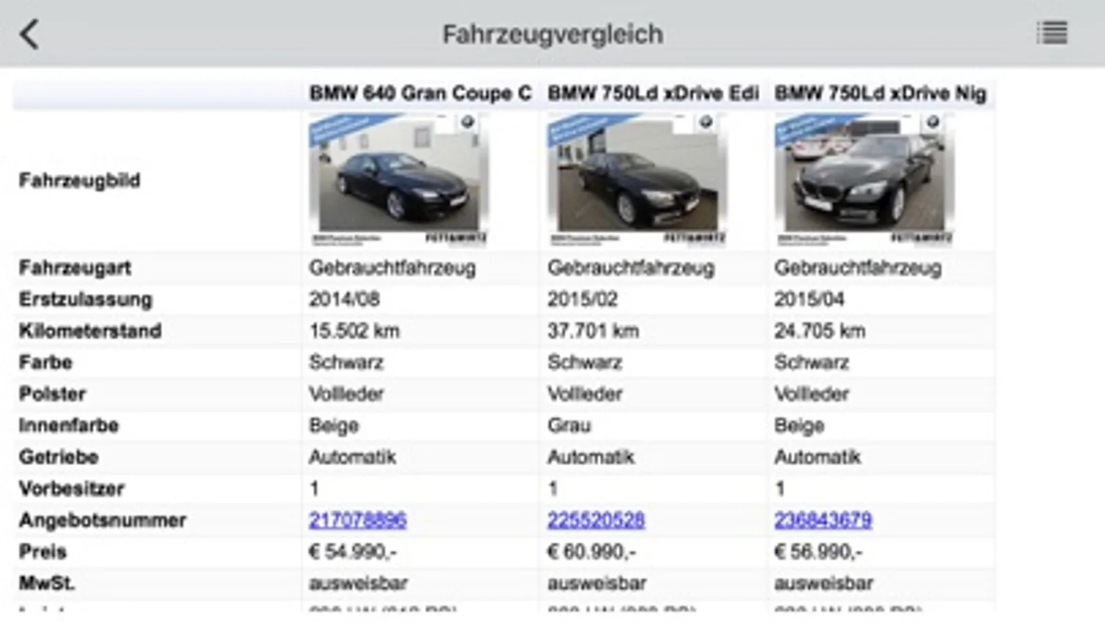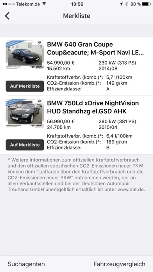 - detaillierter Vergleich ausgewählter Fahrzeuge von der Merkliste
