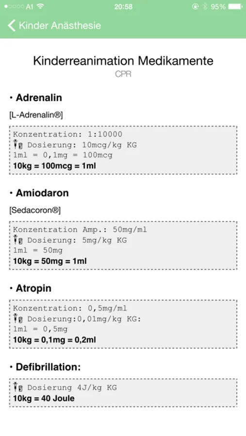 Zu jedem Medikament ist die Dosierung für Kinder „pro ml“ sowie für „10kg PatientenInnen„ rasch abfragbar.