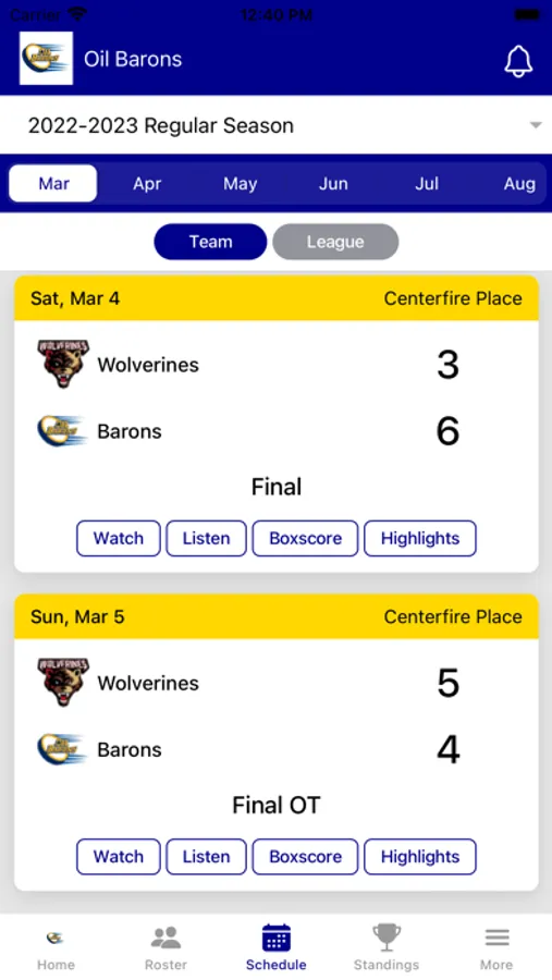 • Schedules for team and around the league