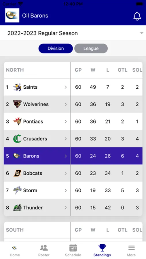 • Standings by Division, Conference and League