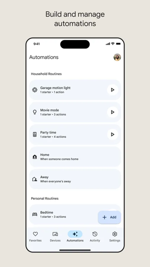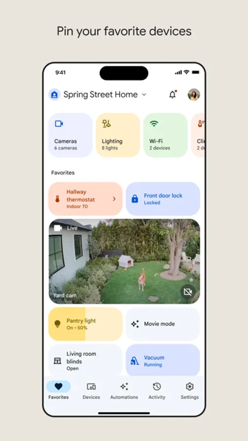 Pin your most-used devices, automations, and actions to the Favorites tab for easy access right when you open the app. View your Nest cameras and doorbell live feeds, and easily scan through event history. Set up and manage Routines in the Automations tab. And quickly edit any permissions in the consolidated Settings tab.