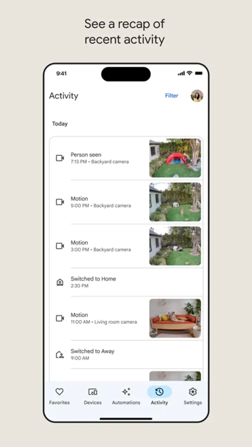 The Google Home app is designed to show you the status of your home and keep you up to date with what you may have missed. Check in on your home anytime and see a recap of recent events.