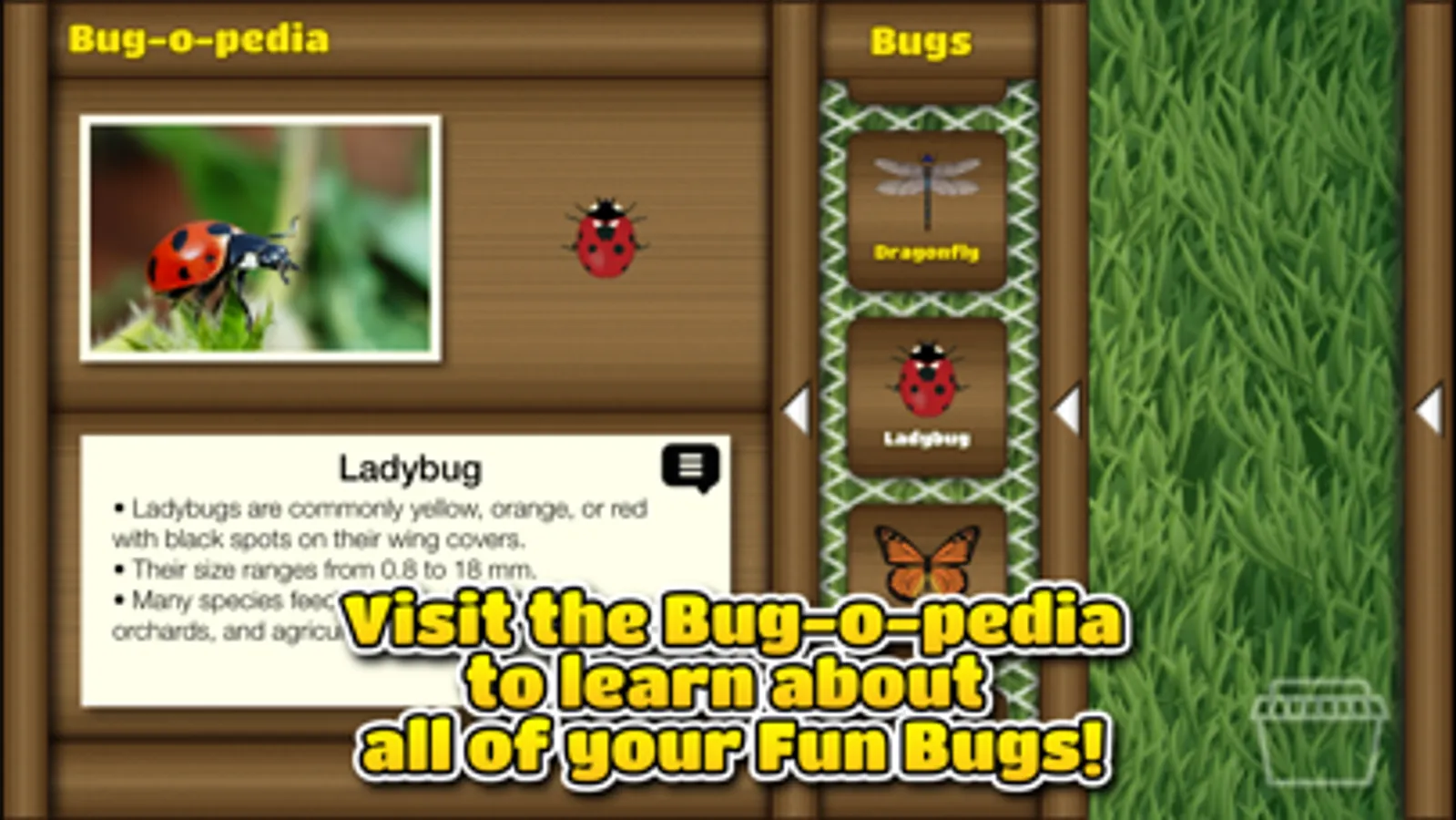 Bug-o-pedia - Learn all about all of your Fun Bugs! All 21 bugs contain unique information. Includes text-to-speech for children that cannot read.