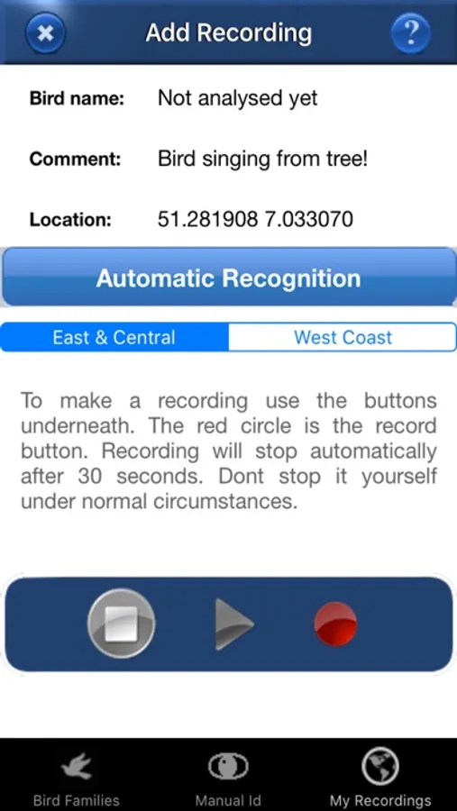 We have included an early version of Automatic Recognition in the app for you to try. We hope this feature will help you identify common bird species. However, it needs a good quality recording to work, and takes a bit of time and patience to get used to. Automatic Recognition takes place on the device, no connection to the internet or mobile network is needed.