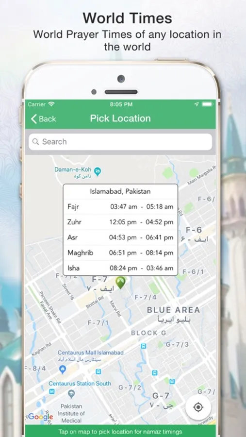 You can view the salah time from anywhere in the world including Pakistan, the US, and the UK. You just need to tap on any location around the world from the map to get the Prayer Timings.