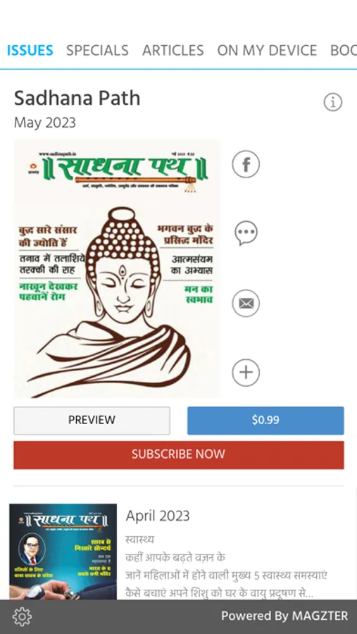 Sadhna Path is a health and wellness magazine which also covers spirituality and ayurveda in collaboration with Sadhna Channel. Sadhna Path is an endeavour taken under the aegis of Diamond magazines, to make discerning and callous people stop aping the West blindly and realise their country's worth. It is a monthly Hindi transformative magazine being published for the last eight years, covering religion, astrology, spirituality, vaastu and Feng Shui. It is a complete magazine for your mind, body and soul.