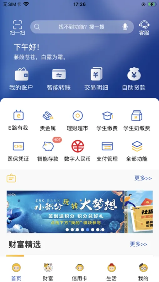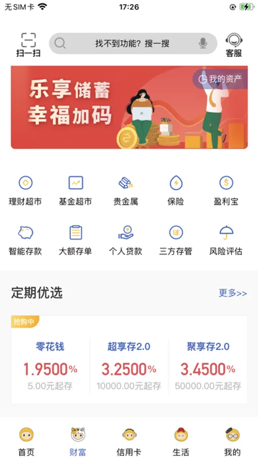 2、财富:理财超市 基金超市 黄金 保险 盈利宝 智能存款 大额存单 个人贷款 理财转让
