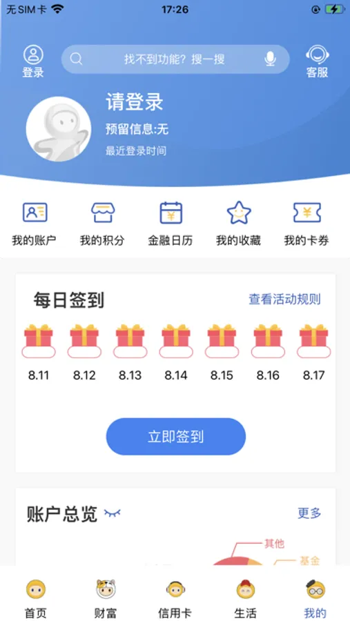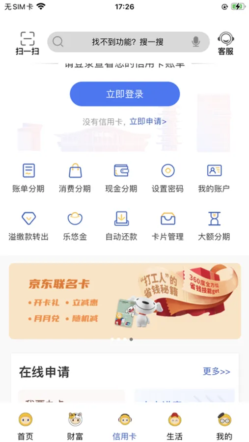 3、信用卡:在线申请 卡片激活 账单分期 消费分期 现金分期 自动还款 卡片管理