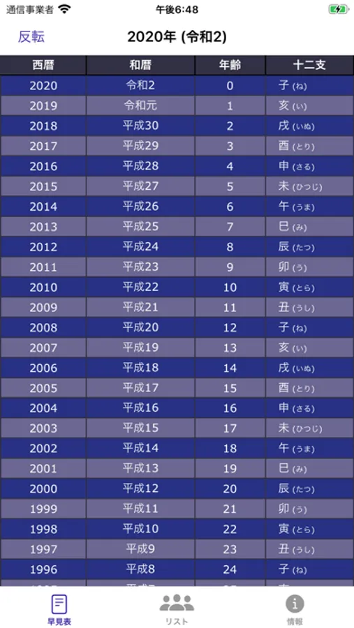 誕生年から和暦(年号)、西暦、年齢、十二支を確認するための早見表アプリです。