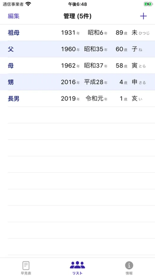 家族、親族、お友達をリストに登録することで、年齢や十二支をすばやく確認することができます。