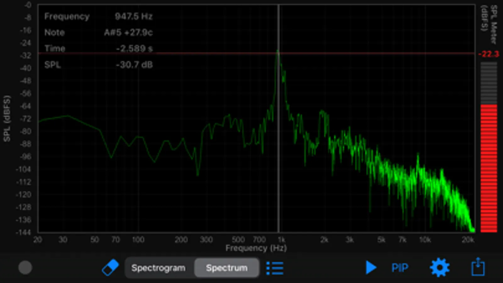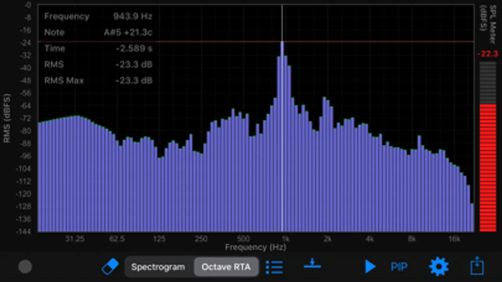 - PIP (picture-in-picture), allows the simultaneous analysis on the spectrogram chart and Second chart: Octave RTA, Spectrum or Oscilloscope