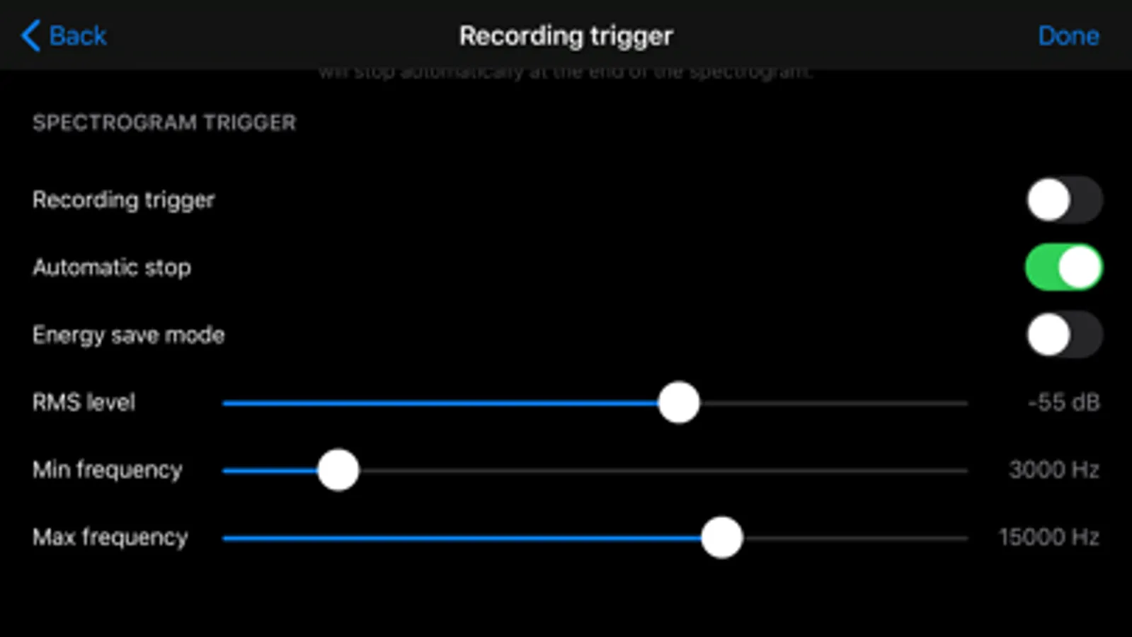 - Recording trigger (triggered by frequencies in the specified frequency band)