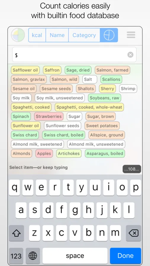 • A small builtin database has most common food items, and you can easily add foods to the database if needed.