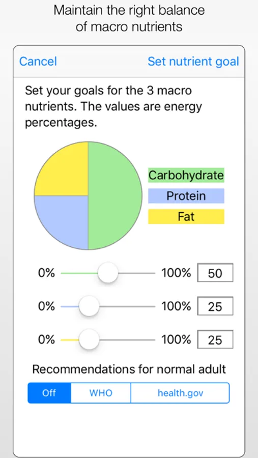 • Set targets for macro nutrient ratios and let Diet Counts help you meet those targets.