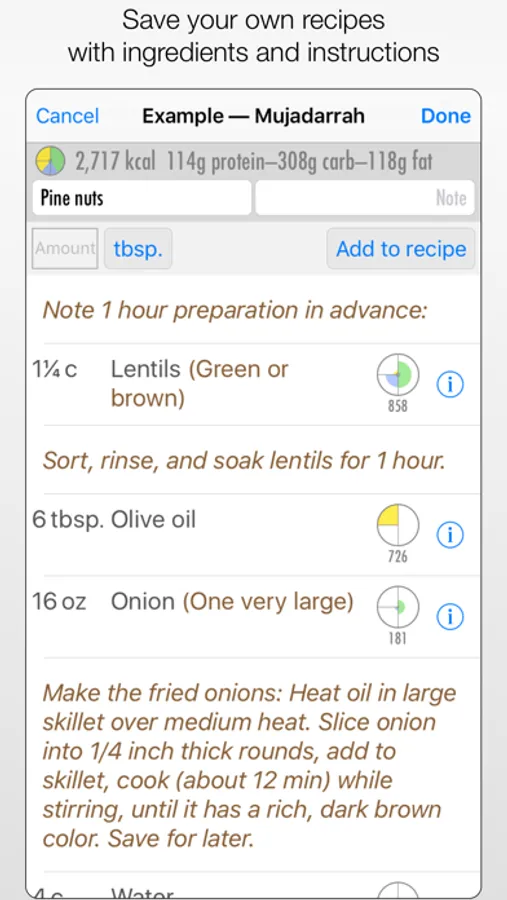 Cook your own meals and keep track of recipes, calories and macronutrients. Enter the items you often eat—snacks or full meals. Add information as needed: just calories, or a complete recipe with ingredients and instructions. You can even export all your recipes to create your own PDF cookbook for safekeeping! —and you can share individual recipes with family and friends via PDF.
