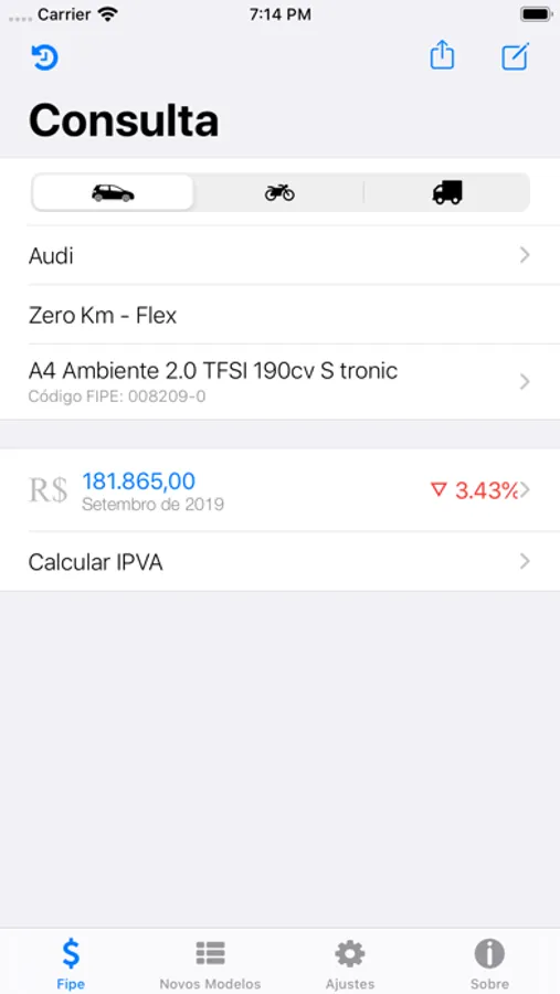• Consultar preços de carros, motos e caminhões, sempre atualizados com a Tabela FIPE.