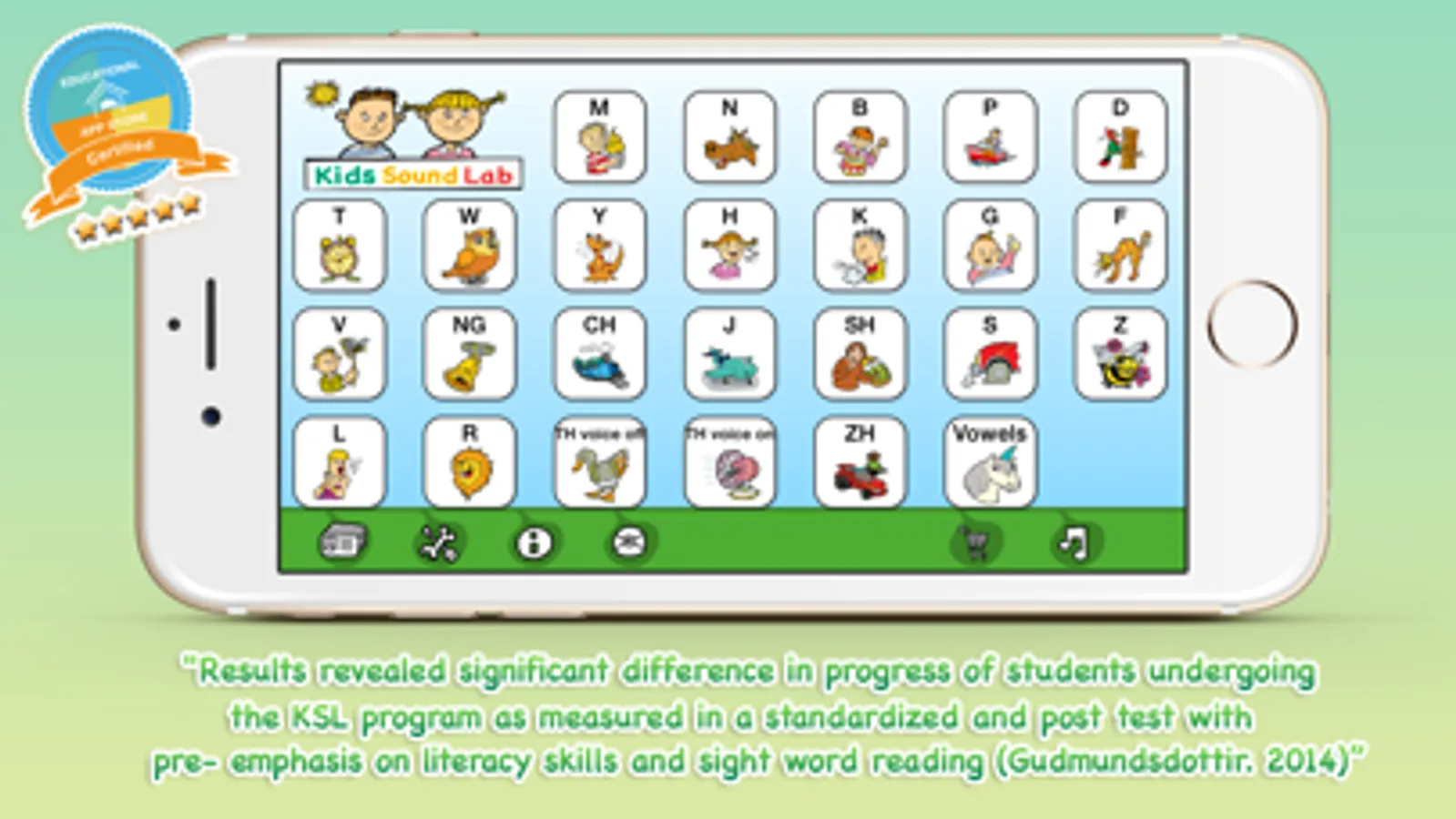 Research shows significant progress when using the methodology of Kids Sound Lab (KSL) to promote correct articulation and literacy in beginning readers attending preschool and first grade. (Gudmundsdottir, 2014, Aevarsdottir, 2016). Consultants for Kids Sounds Lab are Dr. Barbara Hodson at Wichita State Univ., KS, and Dr. Katherine Abbott Verdolini at Univ. of Pittsburg, PA, both leading specialists in the field of articulation, phonology and voice.