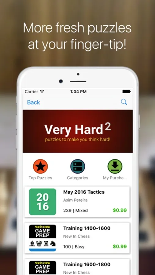 Additional puzzles (Recent Months, Mate themes, Openings etc) available for purchase via the App