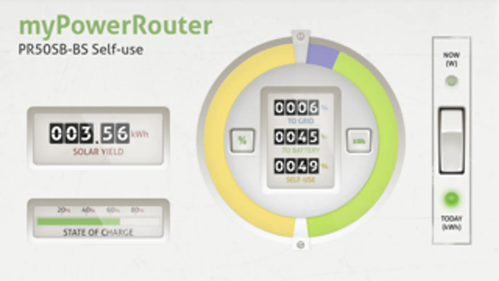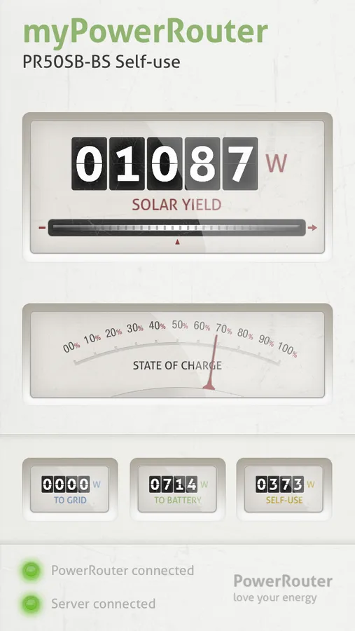 When logged in, the App's dashboard will show the current status of your PowerRouter: How much solar energy is being generated? How much is feed in to the grid, stored in the battery or directly self-used? And what is the state of charge of the battery?