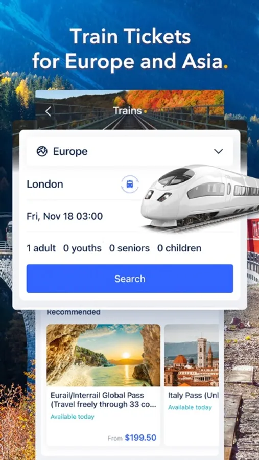 On the Trip.com app, you can now book trains for mainland China, Taiwan, Korea, UK, Italy, Spain, France, and Germany. We connect directly with train information centers for updated schedule information and prices. Our app lets you search quickly through available fares, saving you time and money.