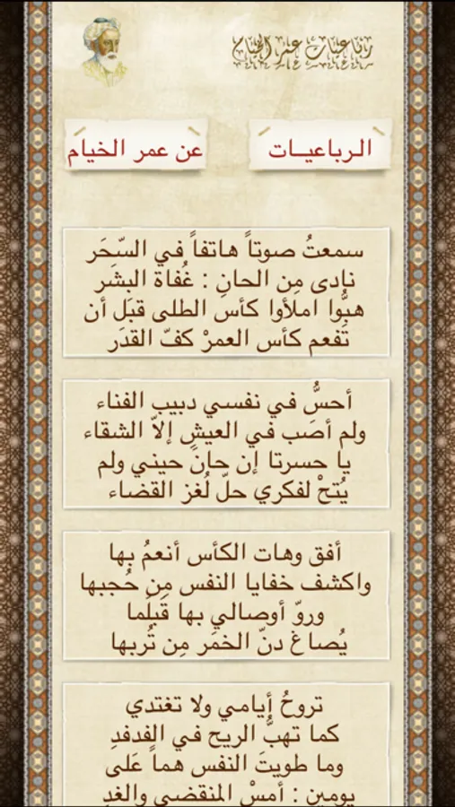 الرباعيات نوع من الشعر مشهور في الشعر الفارسي وقد عرف عن رباعيات عمر الخيّام، وهو شاعر فارسي، وعالم في الفَلَك والرياضيات. ولعلها كُتِبَت في أوائل القرن الثاني عشر الميلادي/ 865 هـ ويأتي العنوان من صيغة الجمع للكلمة العربية رباعية، والتي تشير إلى قالب من قوالب الشعر الفارسي. والرباعية مقطوعة شعرية من أربعة أبيات تدور حول موضوع معين، وتكوّن فكرة تامة.