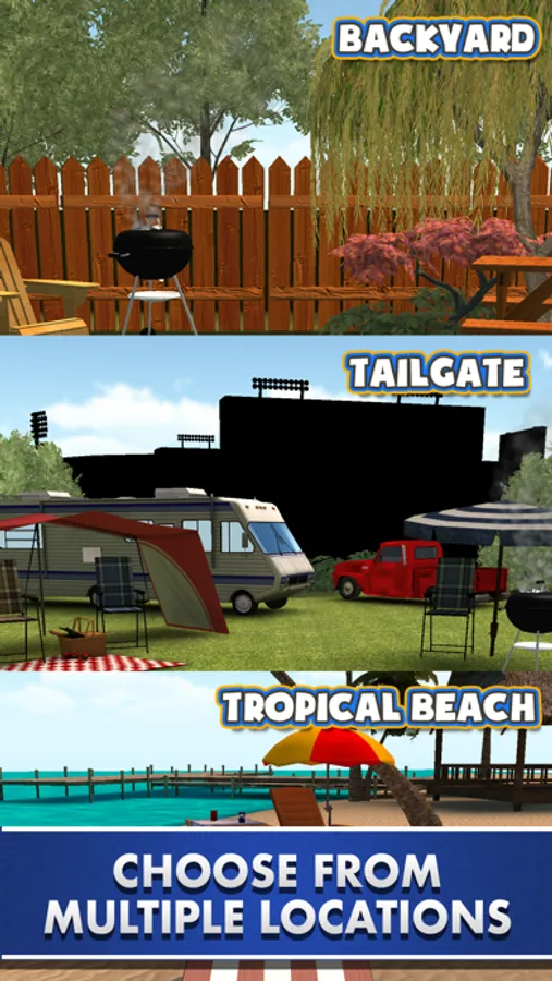 - Multiple environments; Backyard BBQ, Stadium Tailgate, Tropical Beach