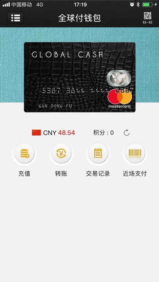 2、 通过刷卡和关联银行卡对全球付账户进行充值。