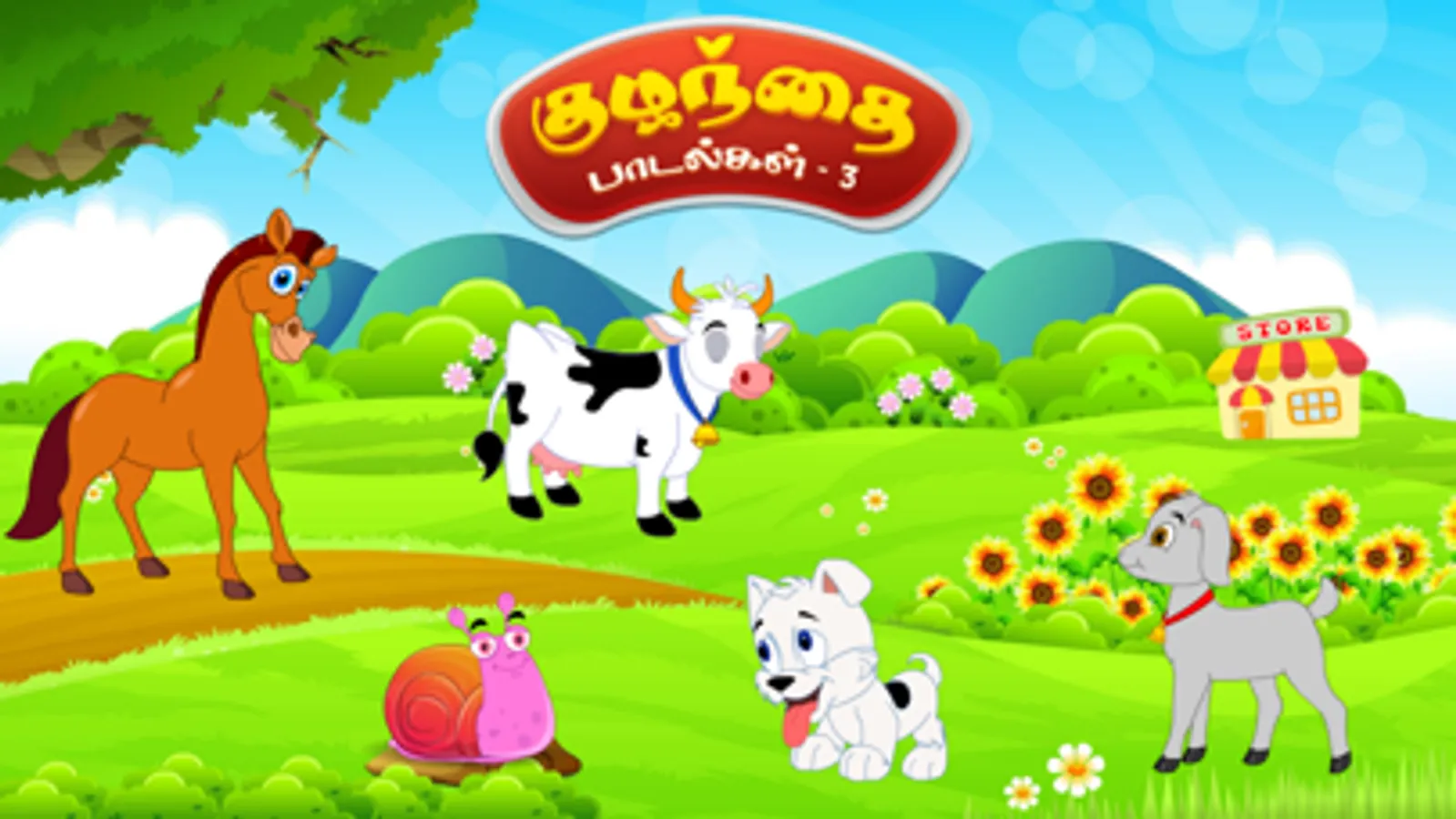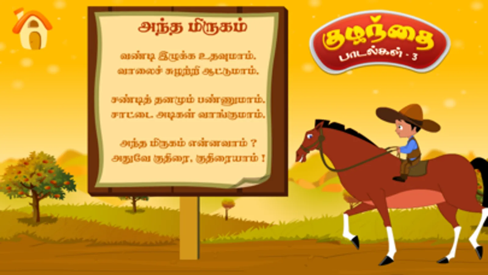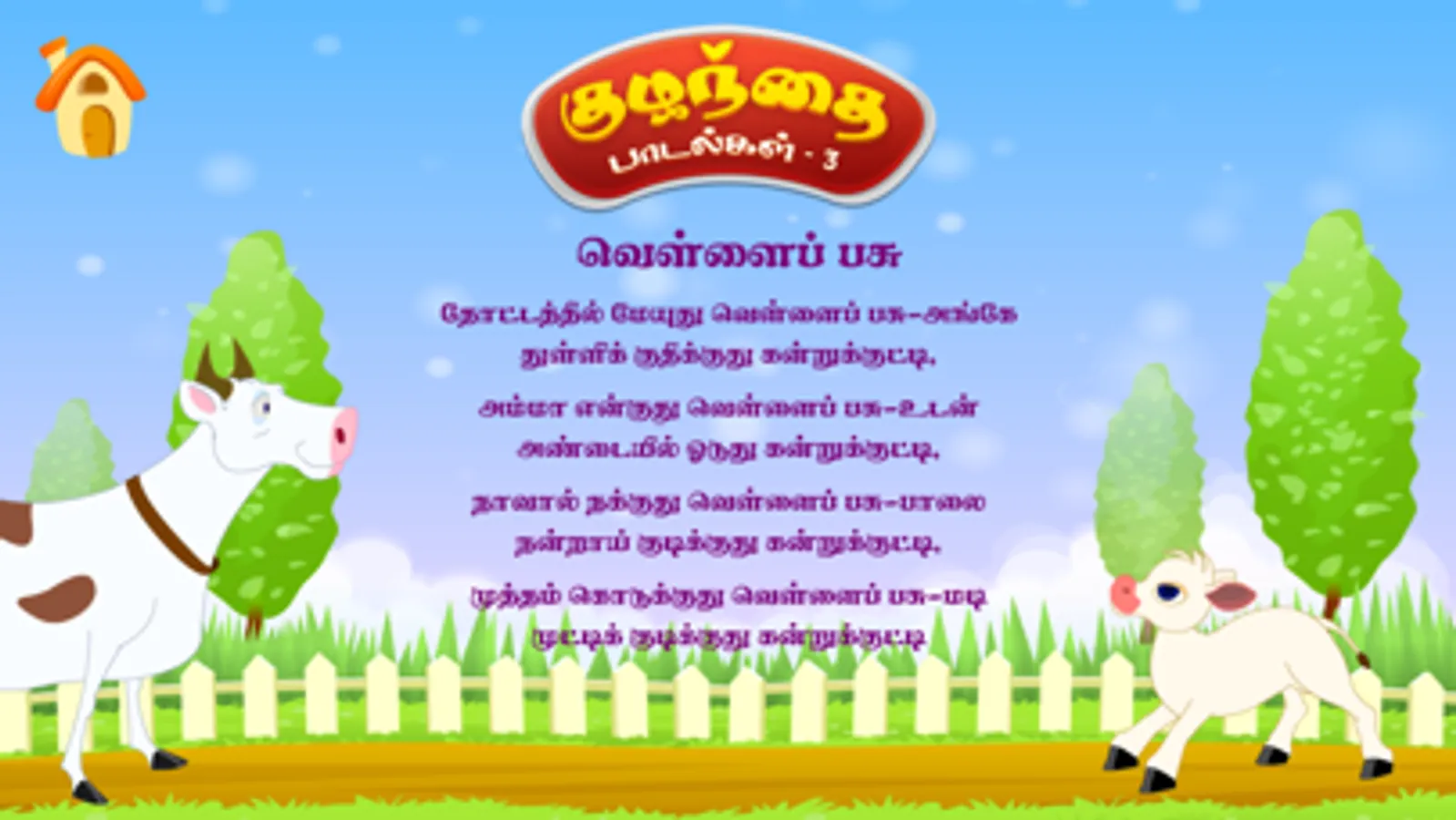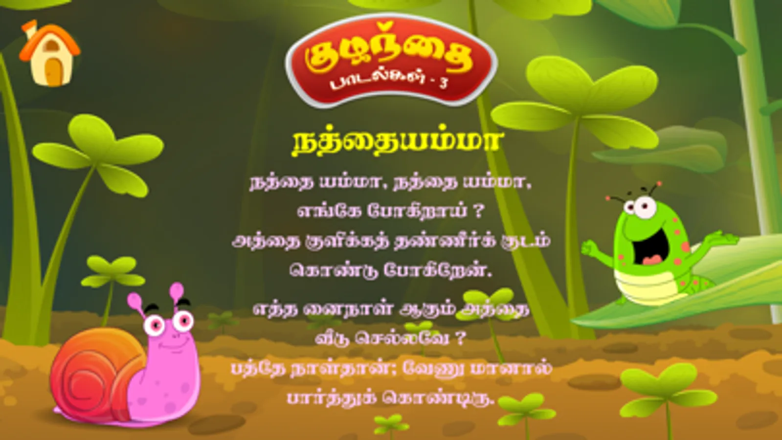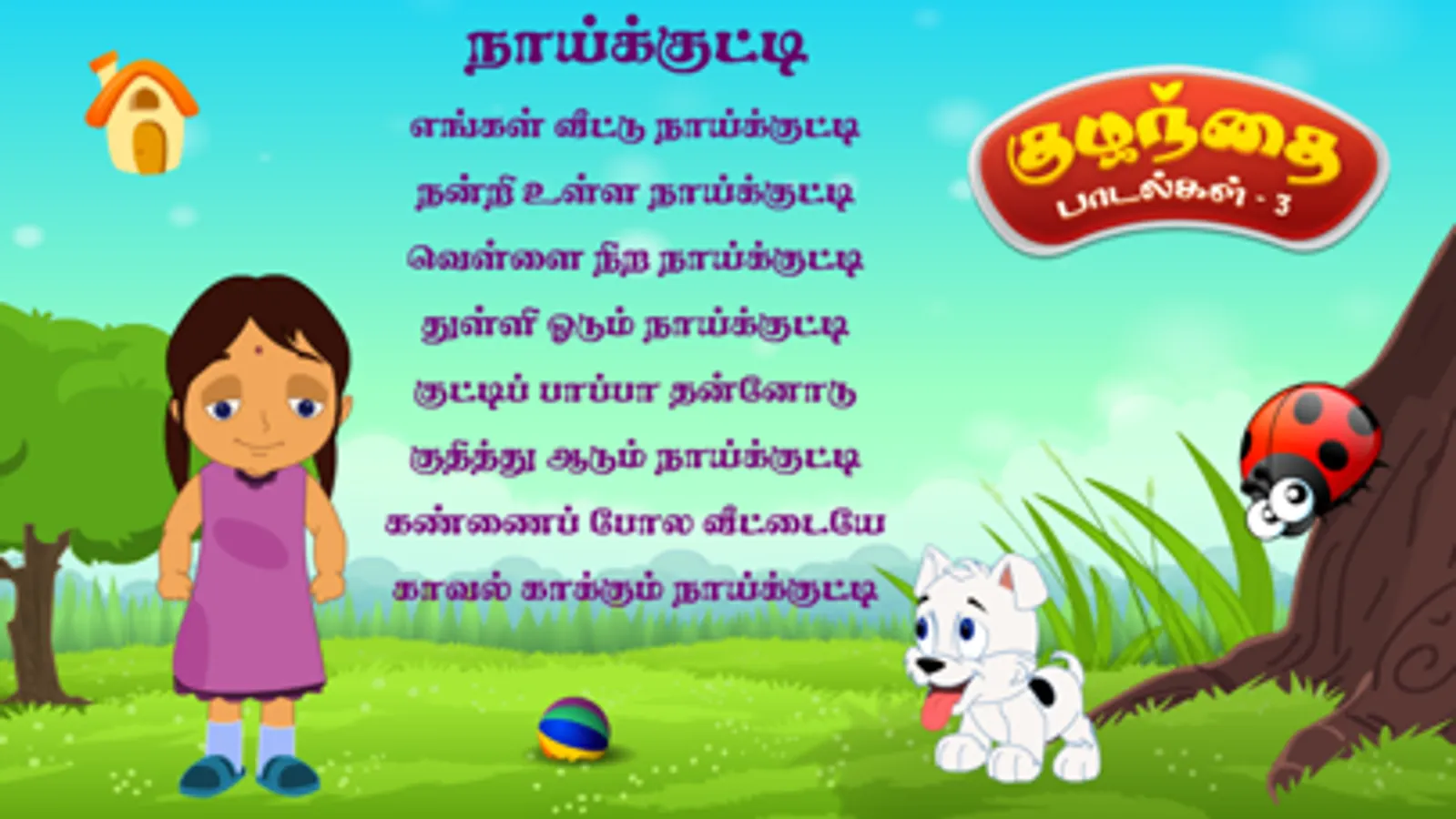 Tamizh Kids Rhymes (Tamizh Kuzhanthai Padalgal), A wonderful Nursery Rhymes app for your kids with songs, music, animations and sing-along. A fantastic app for kids featuring Five popular Nursery Rhymes.