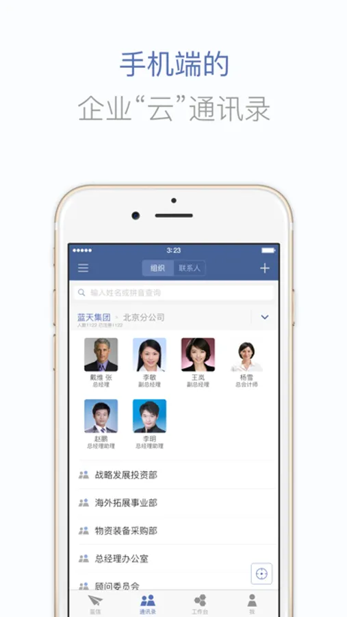 基于手机端的组织“云”通讯录,快速检索联系人,无障碍一键组建工作群组,实现跨层级即时沟通。