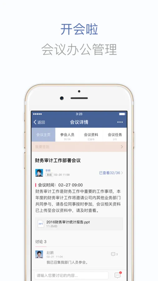 开会啦、移动会务、电话会议、会议室预定,满足各种会议形式的应用需求,同时支持会议过程的实时跟踪和全流程管理,提升会议效率。