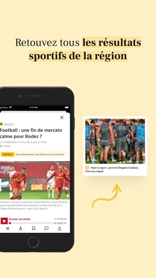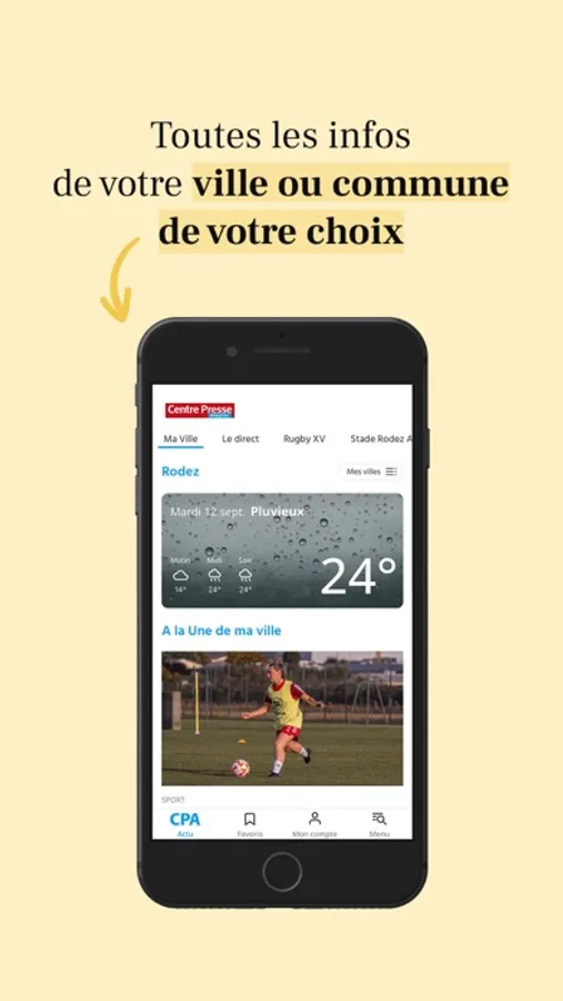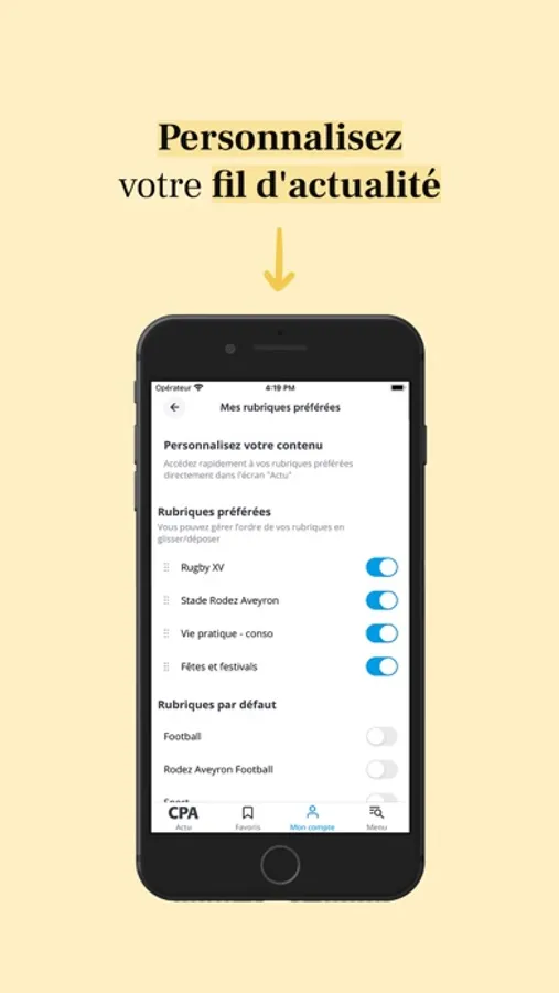 - Composez votre écran d’accueil avec les rubriques de votre choix : Méteo, Sport, Stade Rodez Aveyron, Vie pratique …