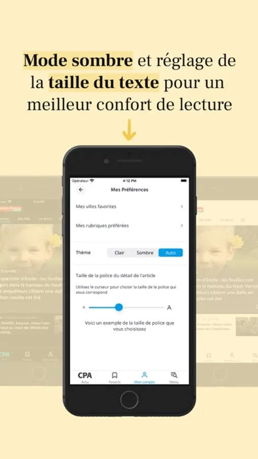 - Mon Compte : pour gérer vos paramètres d’abonnement, de notifications, de newsletters et vos préférences (villes, rubriques, thème de l’application sombre ou clair et la taille de la police)