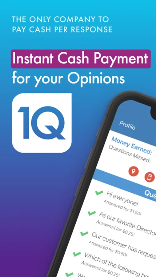 Who is 1Q? 1Q connects top brands to a panel of consumers who want to be rewarded for their candid feedback. 1Q is the only company in the world to pay consumers up to $0.25 instantly, per question, directly to your PayPal account. Join over 1 million people who have already started being paid for their valuable opinions. Join now and turn your opinions into cash.